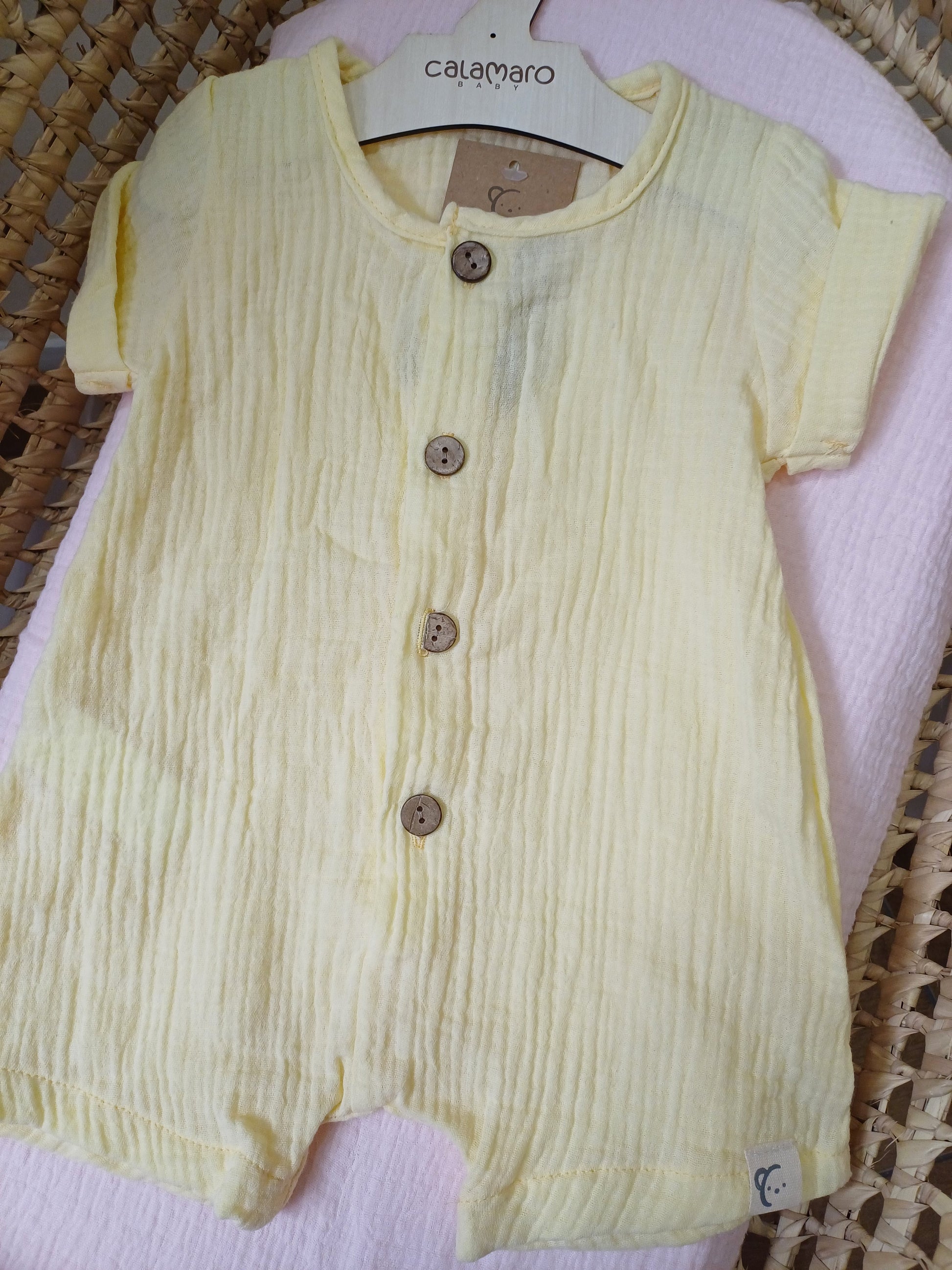 Pagliaccetto per bambini in mussola di cotone, leggero e traspirante. Morbido sulla pelle, ideale per le giornate calde. Design semplice ed elegante, arricchito da pratici bottoni in legno sul davanti per una facile vestizione. Perfetto per un look naturale e confortevole.