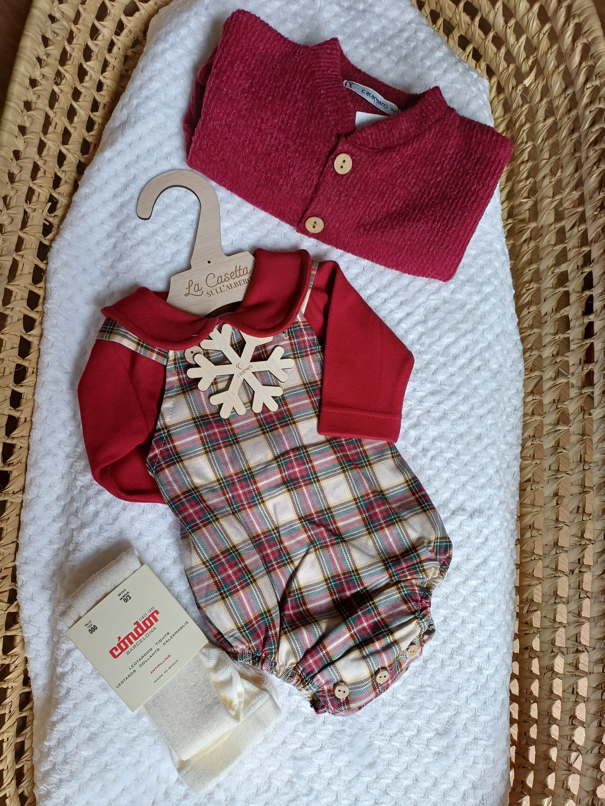 Pagliaccetto in tartan con fondo bianco e delicate linee verdi e bordeaux. Realizzato in tessuto morbido e confortevole, unisce eleganza e praticità. Perfetto per le occasioni speciali o le feste invernali, dona al neonato un look classico e raffinato con un tocco tradizionale scozzese.