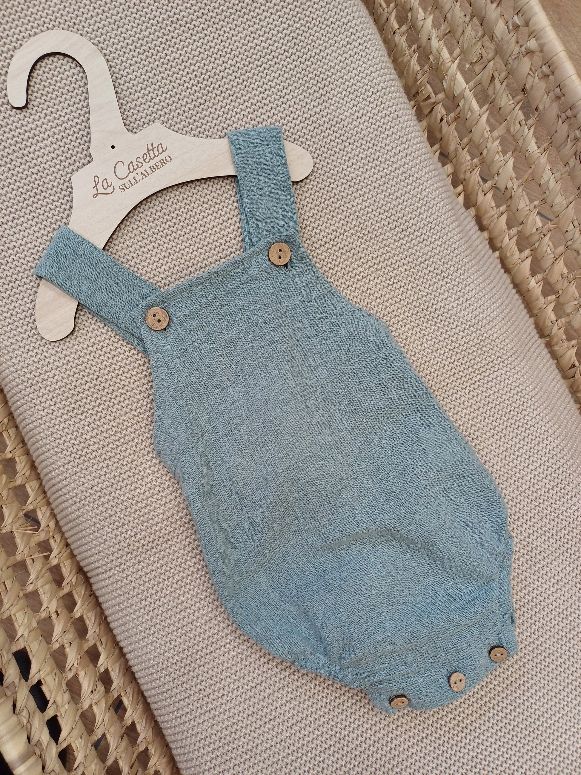 Salopette bimbo in morbida mussola di cotone, leggera e traspirante, ideale per la stagione calda. Bottoncini in legno sul davanti donano un tocco naturale e facilitano la vestizione. Linea semplice ed elegante, perfetta per un look comodo e raffinato.