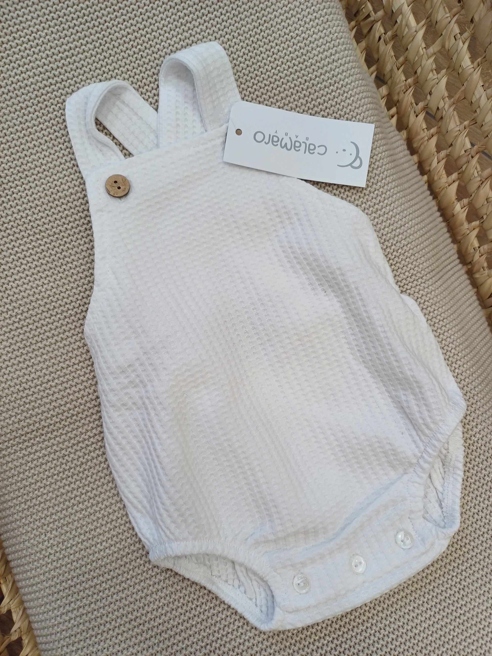 Salopette per neonati in morbido tessuto nido d’ape, delicato e traspirante. Dotata di due bottoncini in legno sul davanti per un tocco naturale e bottoncini di chiusura sotto per facilitare il cambio. Ideale per un look comodo, pratico e raffinato.