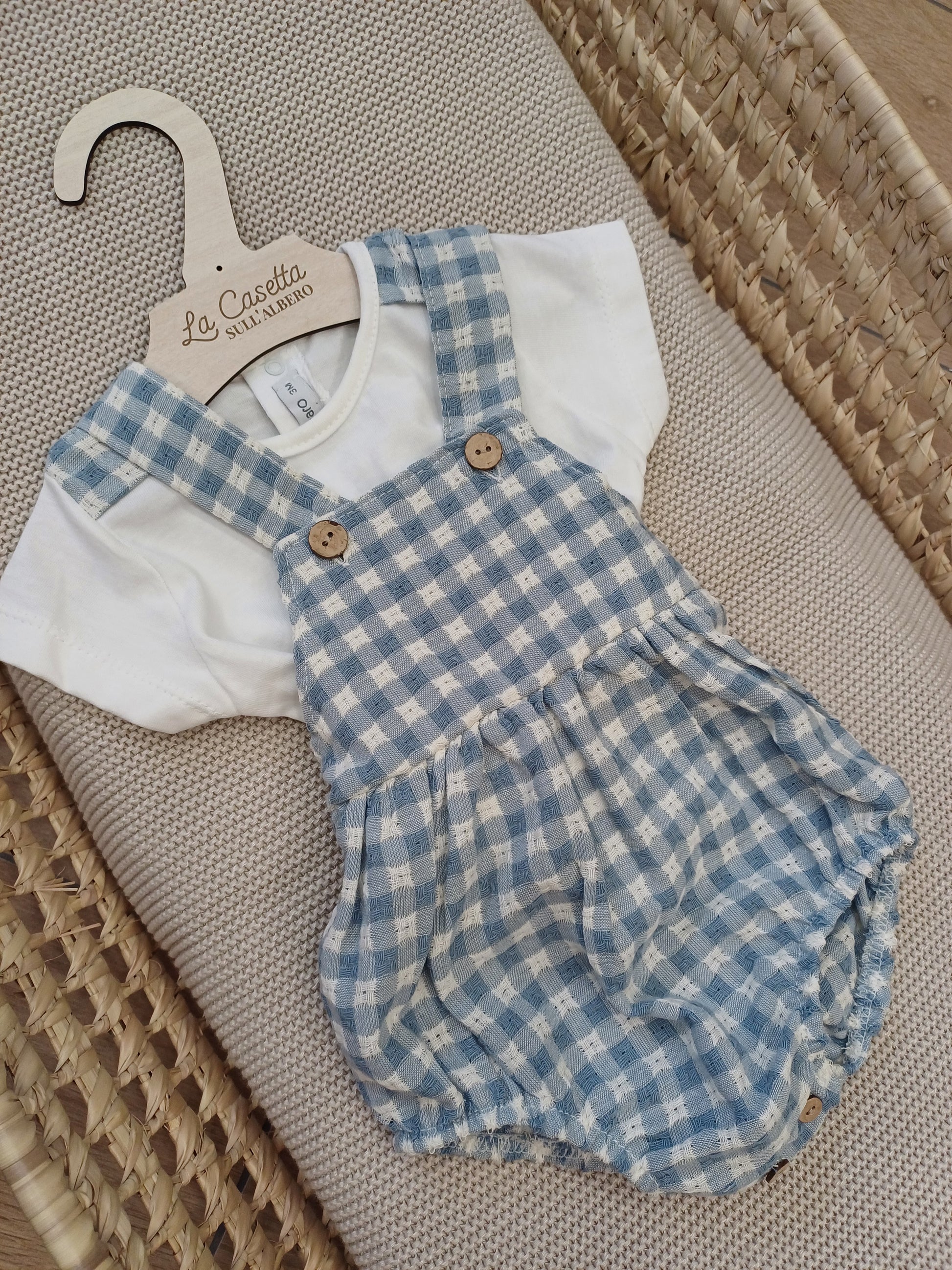 Completo bimbo con salopette a quadri bianchi e azzurri, dotata di due bottoni in legno sul davanti e pratica chiusura sotto. Abbinata a una maglietta bianca a maniche corte con bottoncini sul retro. Fresco, comodo e dal gusto classico, perfetto per ogni occasione estiva.