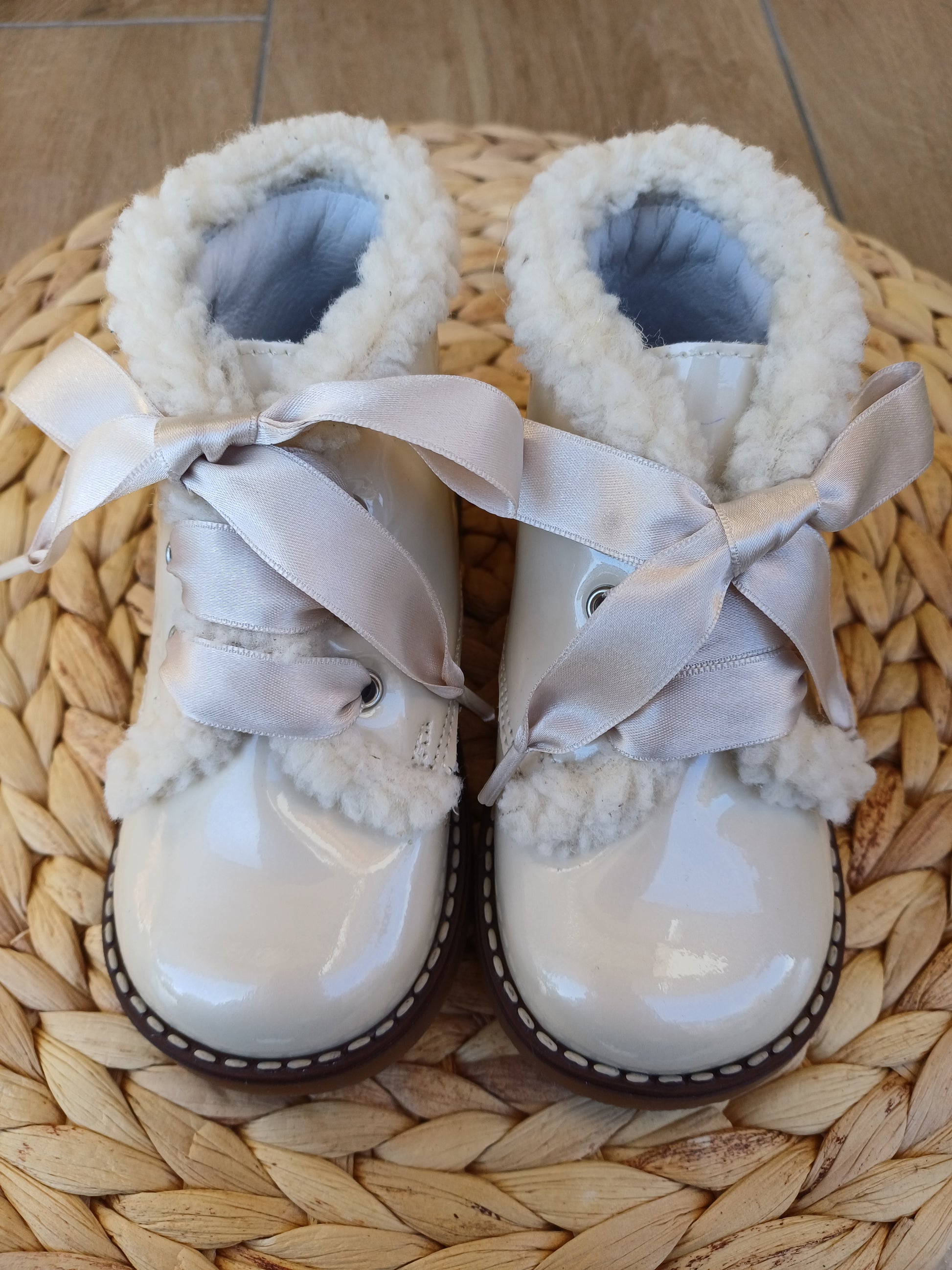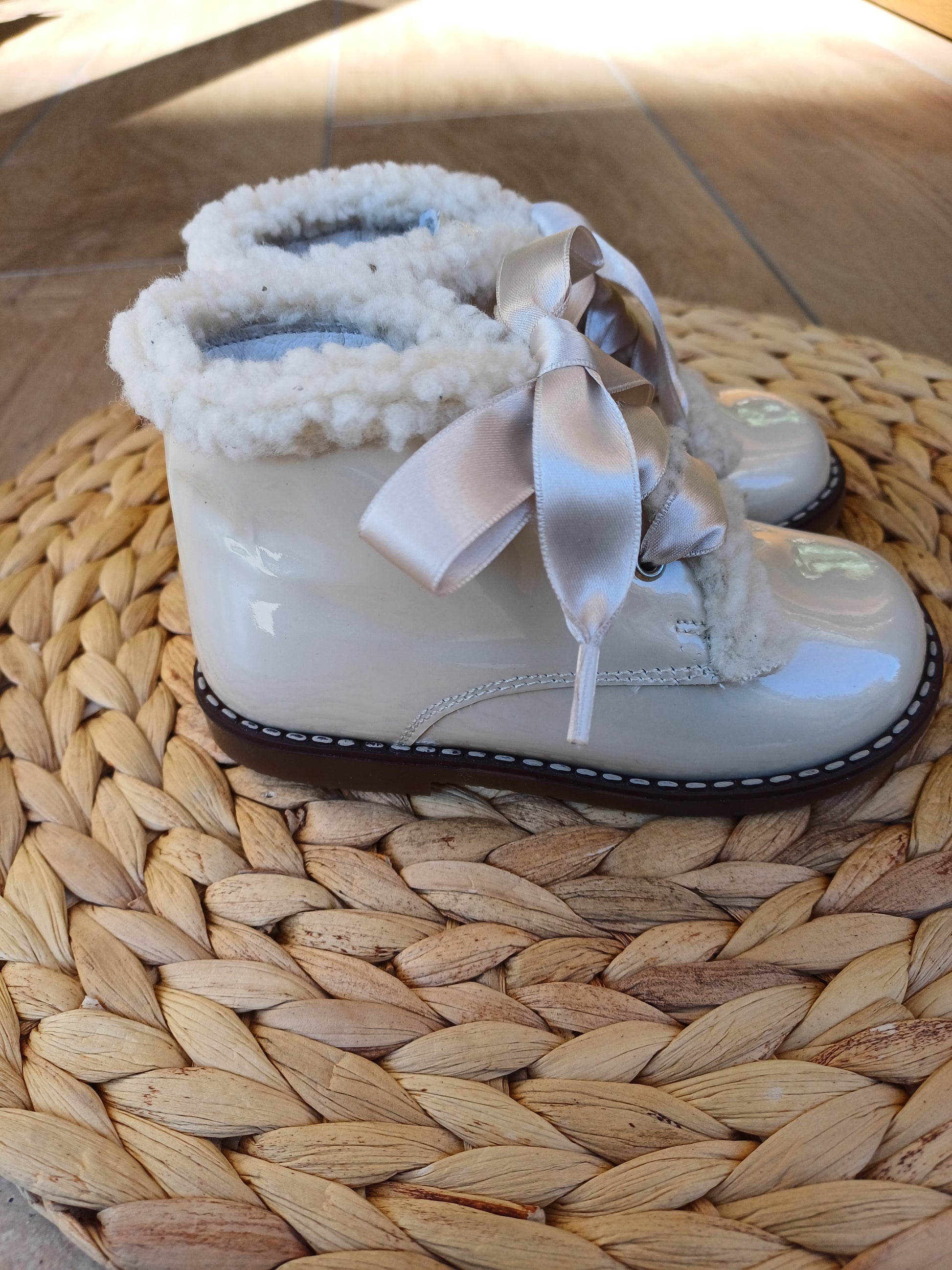 Scarponcino in pelle con morbida pelliccetta applicata sul collo del piede, lasciando l’interno liscio e traspirante. Chiusura con lacci in raso color champagne che aggiungono un tocco raffinato. Suola robusta e flessibile, ideale per unire eleganza e praticità nelle stagioni più fresche.