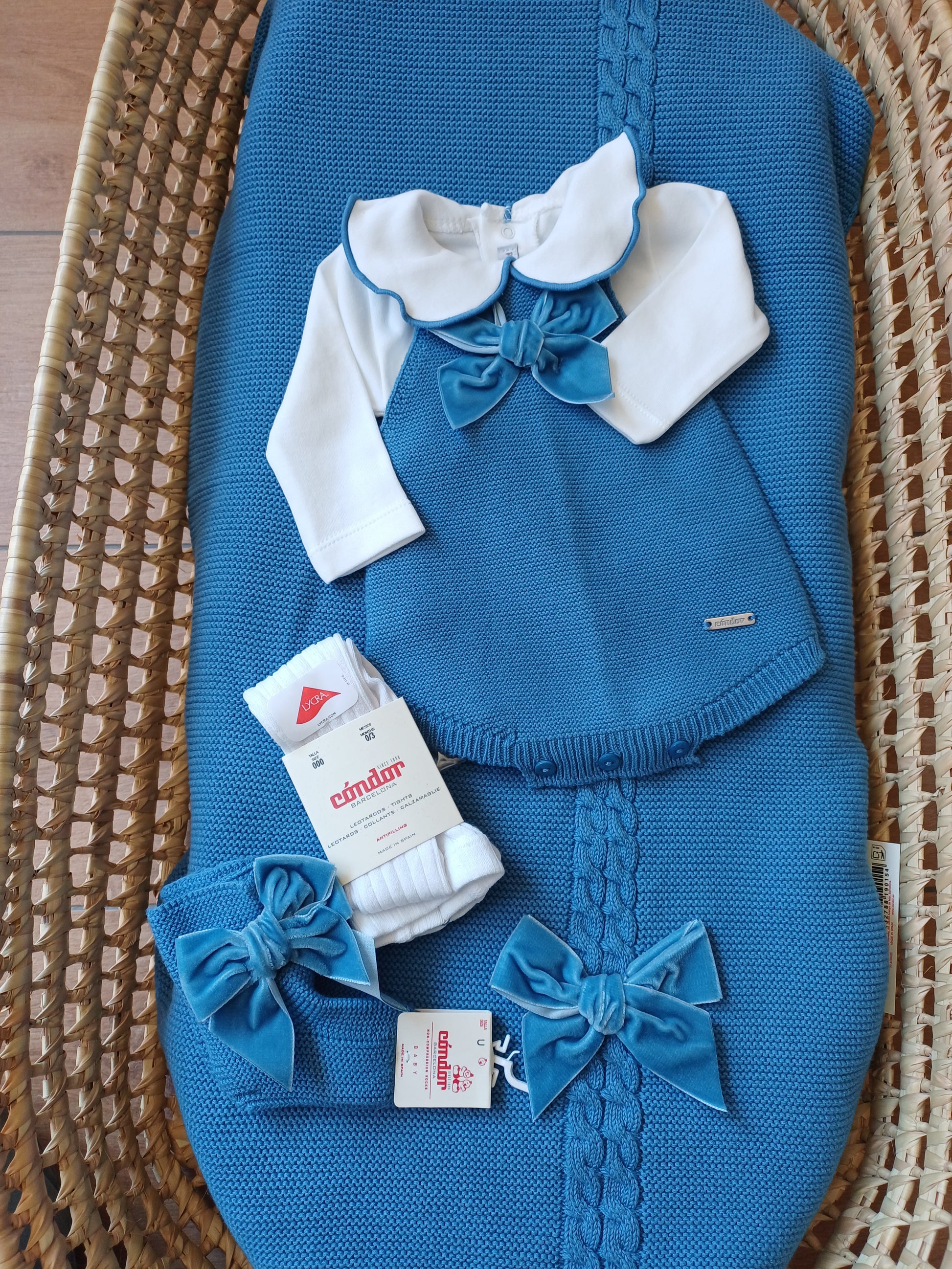 Pagliaccetto in caldo cotone, di un tono poco più chiaro dell’indaco, morbido e avvolgente. Impreziosito da un fiocco in velluto coordinato, semplice ma raffinato, dal fascino elegante e delicato.