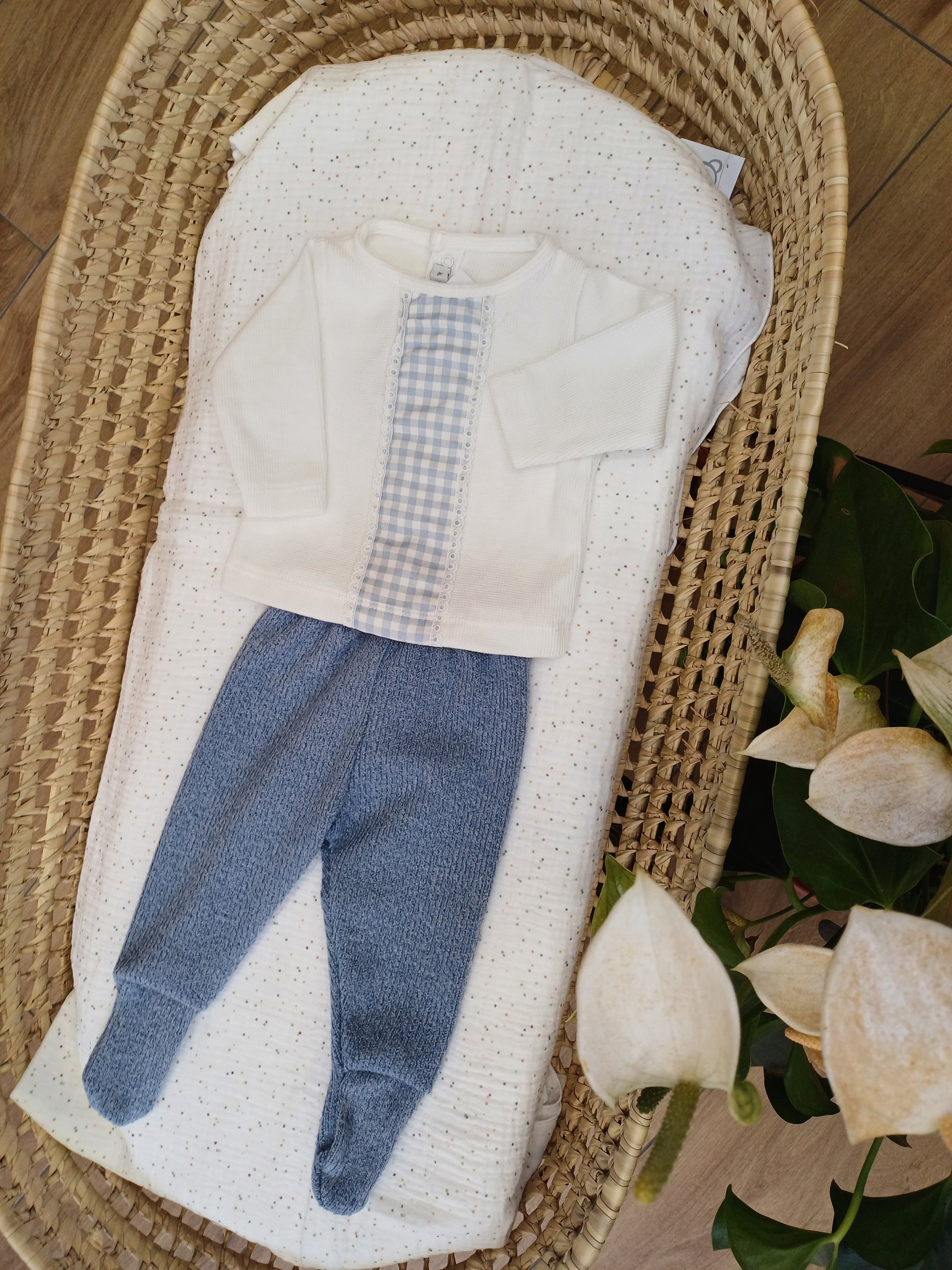 Tutina due pezzi in morbida viscosa a maniche lunghe. Maglietta bianca con pannello frontale a quadretti bianchi e azzurri, rifinito con delicato pizzo laterale. Chiusura posteriore con bottoncini bianchi a clip. Pantalone coordinato color avion, comodo ed elegante. Perfetta per un look curato e confortevole.