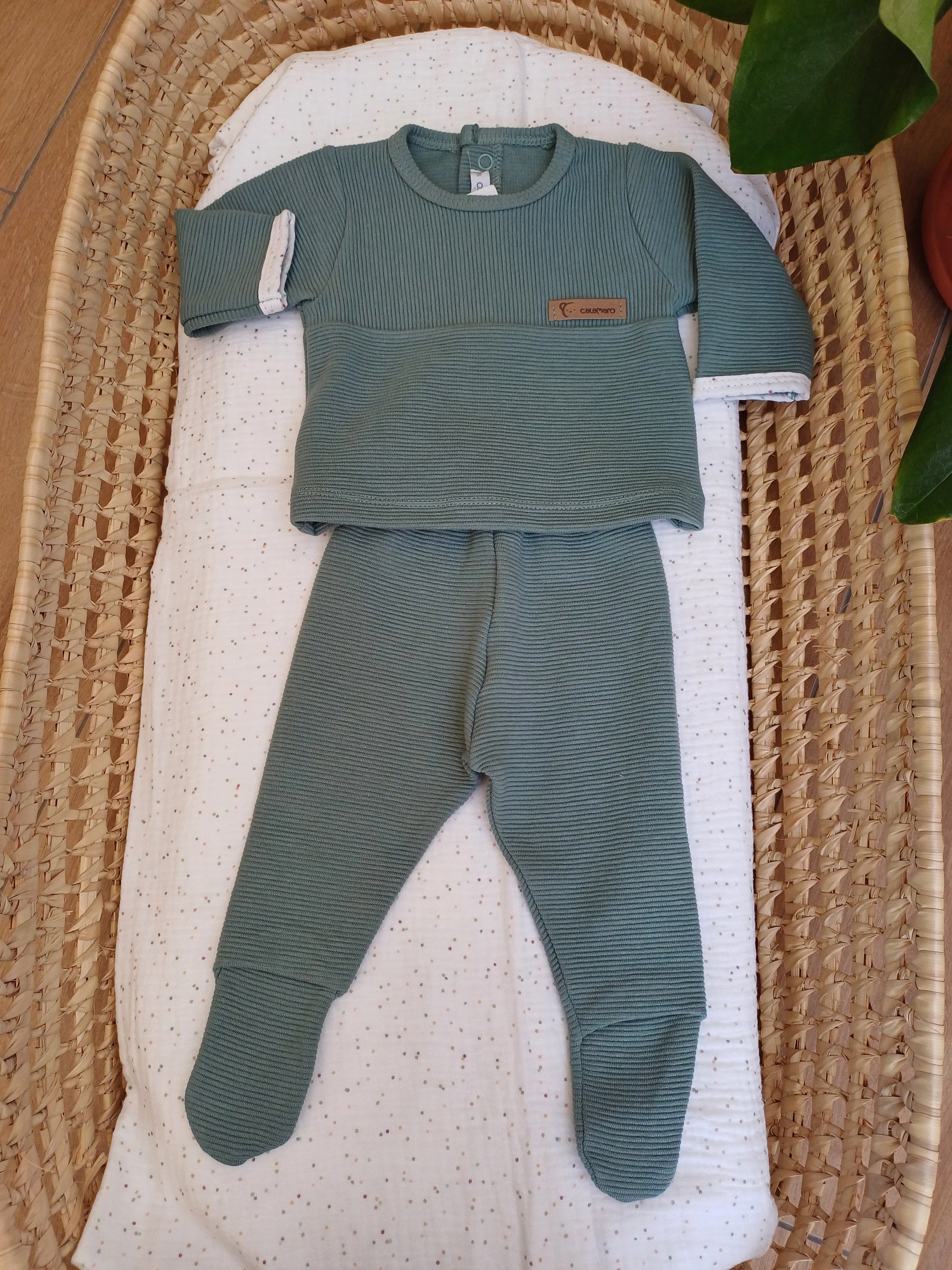 Tutina due pezzi bimbo verde, con maglietta a manica lunga e chiusura posteriore con bottoncini tono su tono a clip. Pantalone lungo coordinato dello stesso colore, comodo e pratico. Un completo semplice e versatile, perfetto per il comfort quotidiano con un tocco di stile.