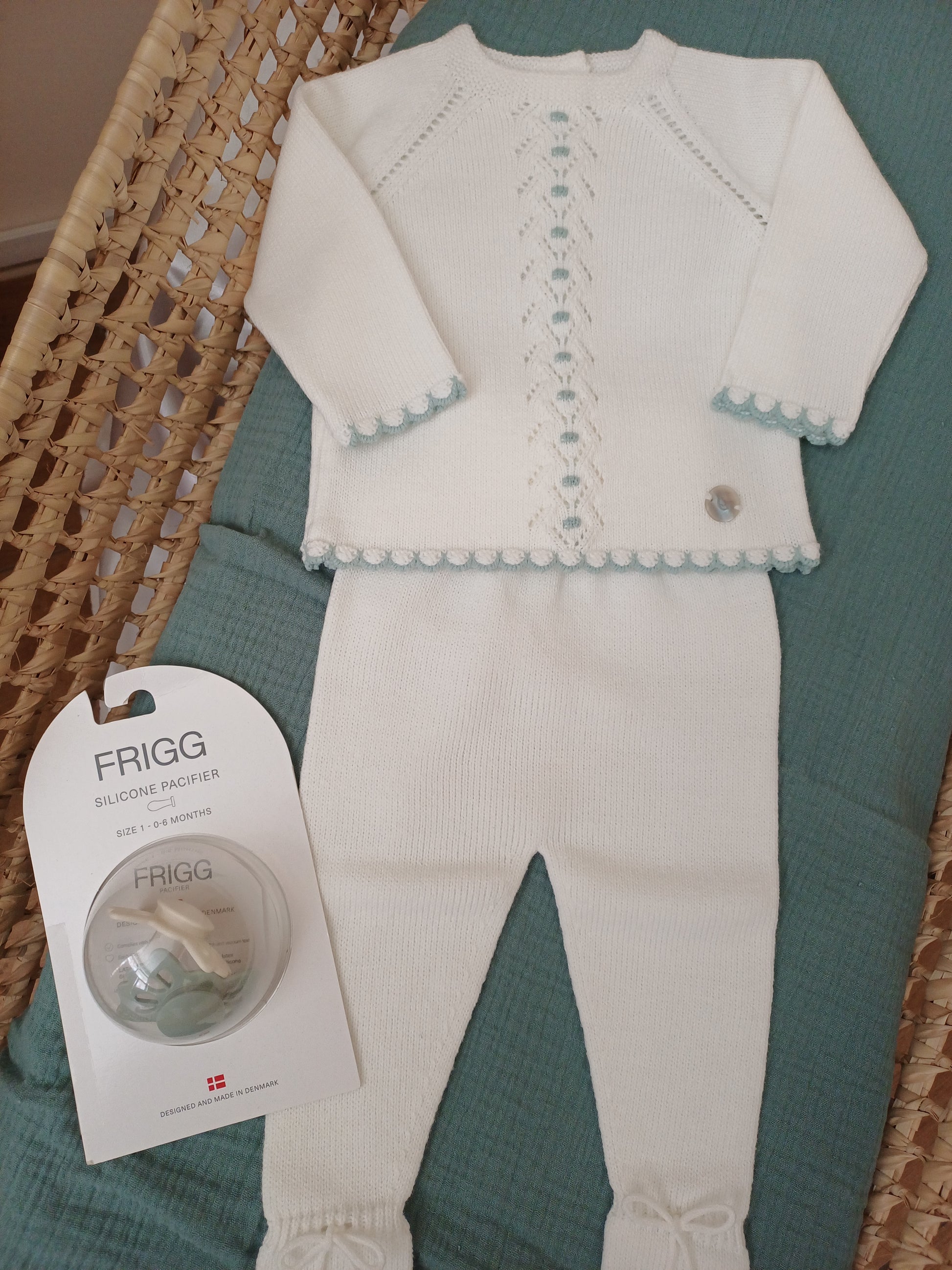 Delicata tutina in maglia bianca con dettagli verde ai bordi e motivo traforato centrale. Completa di maglioncino a maniche lunghe e pantaloncini con fiocchi alle caviglie.