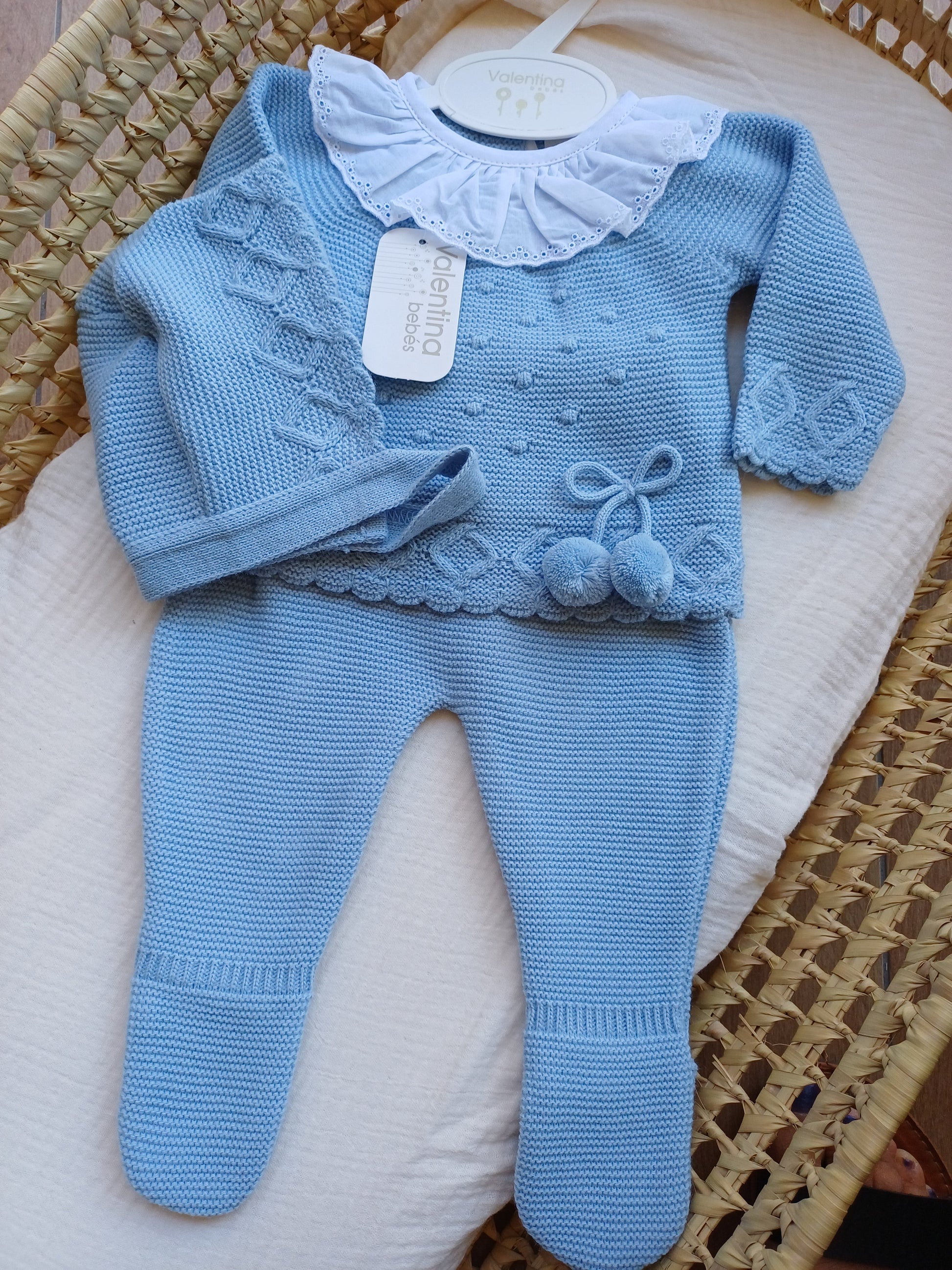Elegante tutina due pezzi in caldo cotone azzurro, composta da maglietta a maniche lunghe con colletto in pizzo San Gallo e delicati pon pon sul fondo. Pantaloni con piedini e cuffietta coordinata completano il look, per un insieme morbido, raffinato e accogliente.