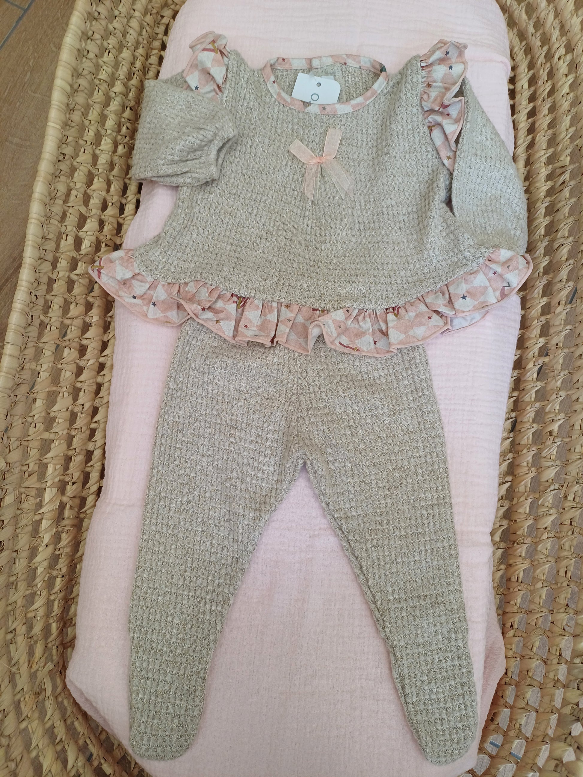 Tutina due pezzi beige per bimba, con maglietta a manica lunga arricchita da rouches in fantasia circo rosa su spalle e fondo. Delicato fiocchetto in raso rosa sul davanti. Chiusura posteriore con bottoncini in madreperla. Pantaloni coordinati beige, per un look dolce, curato e confortevole.