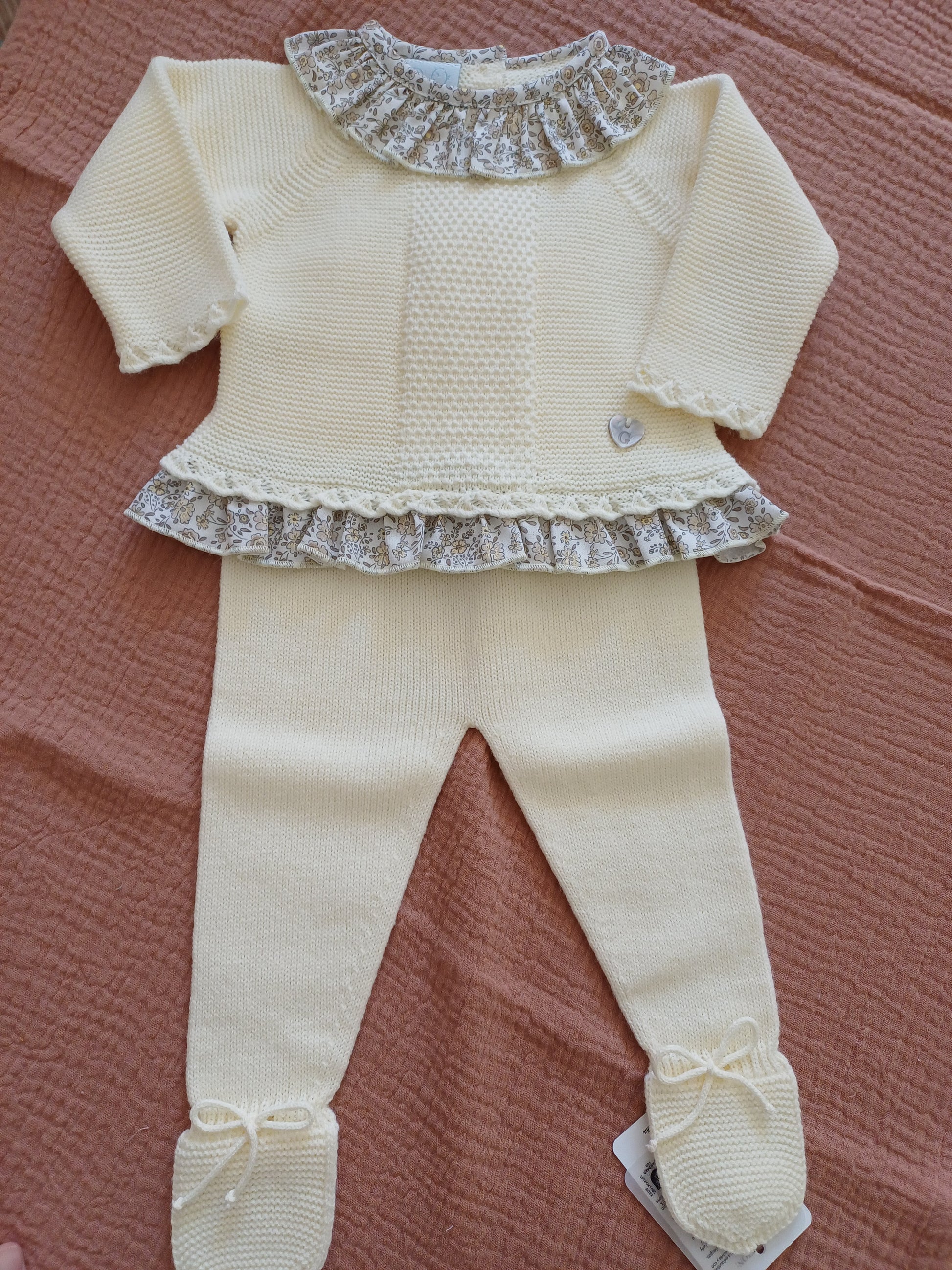 Dolcissima tutina due pezzi bimba in giallo paglierino, con colletto e rouches in fantasia floreale coordinata. Il pantalone lungo con piedini è arricchito da fiocchettini tono su tono. Morbida e raffinata, perfetta per un look romantico e delicato.
