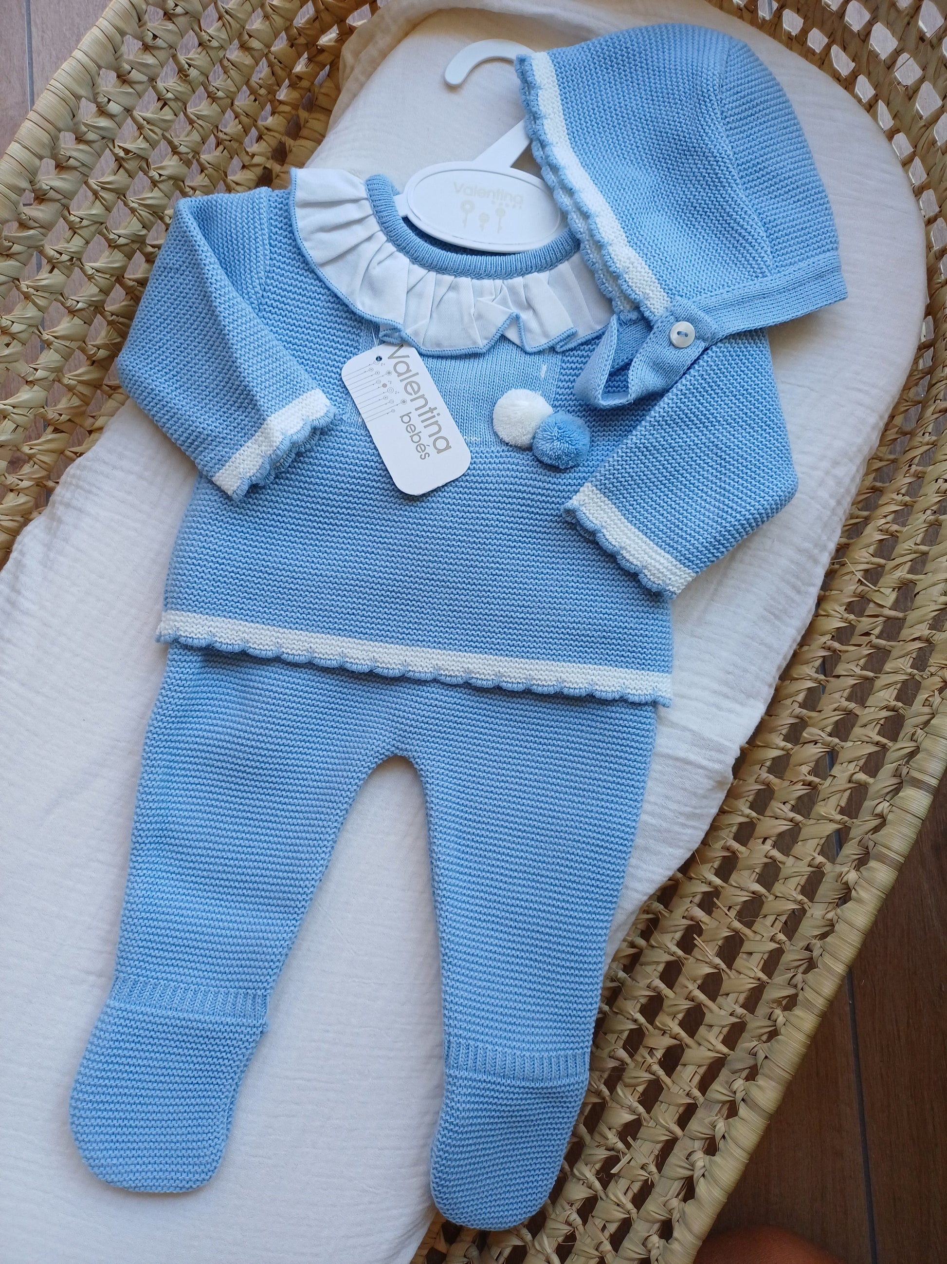 Tutina due pezzi in caldo cotone azzurro: maglietta lavorata con maniche lunghe, pon pon bianco e azzurro, chiusura posteriore con bottoncini bianchi e raffinato colletto in cotone. Completa di cuffietta coordinata, offre eleganza e comfort ideale per i primi mesi del neonato.