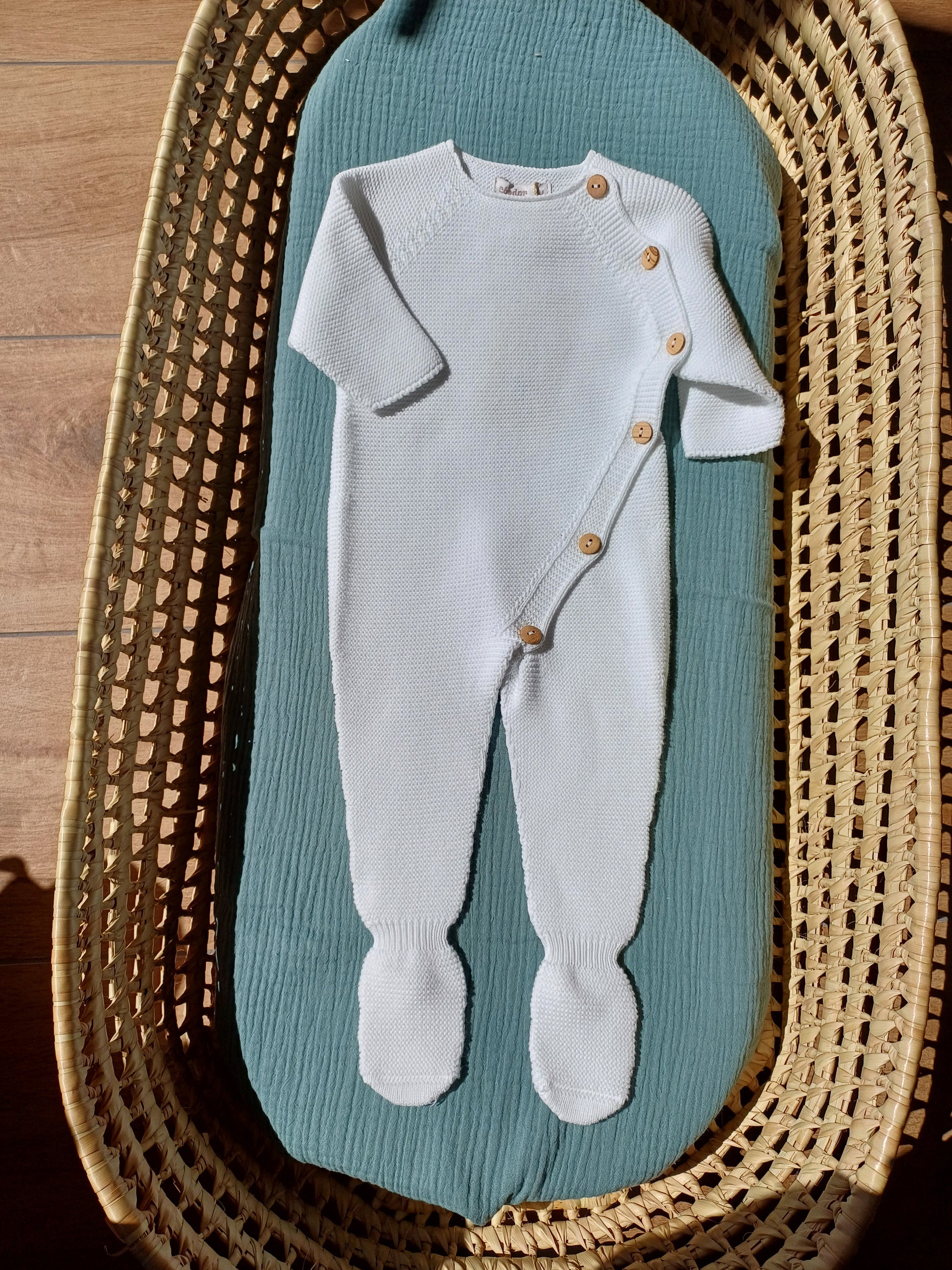 Tutina bimbo a manica lunga in pregiato filo di cotone bianco, delicata e traspirante. Chiusura frontale con raffinati bottoncini in legno, unisce eleganza e praticità. Ideale per l’uscita clinica, avvolge il neonato in comfort e stile nei suoi primi momenti speciali.