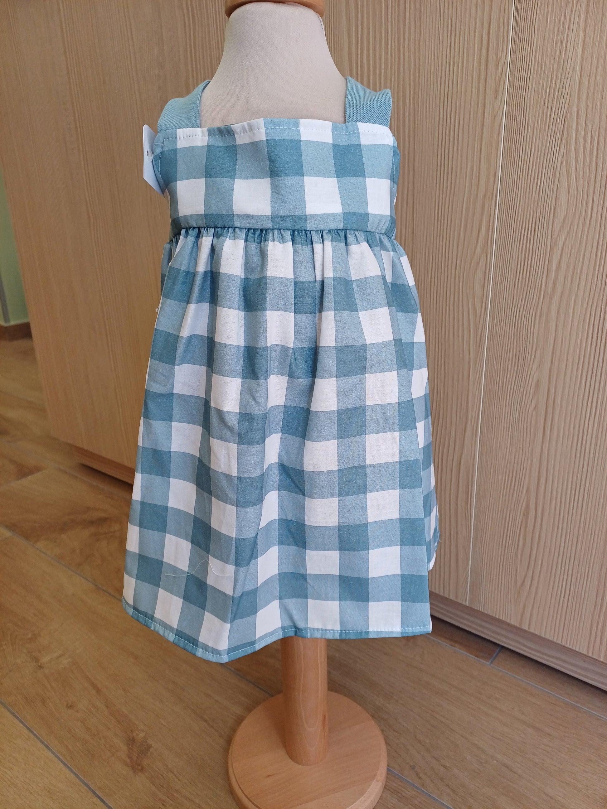 Vestitino in cotone leggero a bretelle, con vivace fantasia a quadri nei toni del bianco e petrolio. Sul retro, un elegante fiocco aggiunge un tocco di dolcezza. Fresco e comodo, ideale per l’estate e perfetto per occasioni informali con uno stile semplice ma curato.