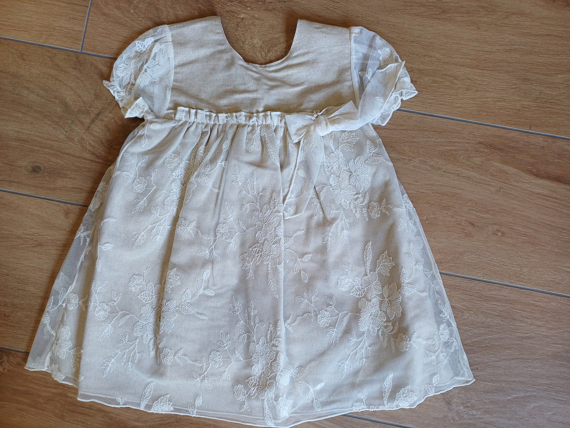 Elegante vestito da cerimonia per bimba in lino, arricchito da delicato pizzo floreale. Le maniche, anch’esse in pizzo, donano leggerezza e raffinatezza. Un fiocco sul davanti completa il look con un tocco romantico. Perfetto per occasioni speciali.