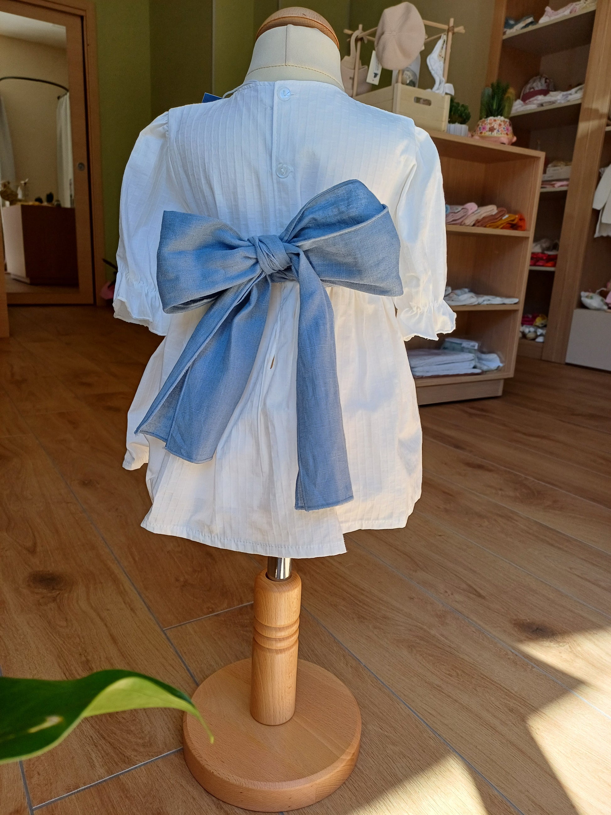 Vestito bianco da cerimonia in cotone con sottoveste, maniche lunghe e raffinata cintura in tessuto color indaco, annodata sul retro con uno splendido fiocco. Chiusura posteriore con delicati bottoncini tono su tono. Elegante e romantico, ideale per occasioni speciali con un tocco di colore raffinato.